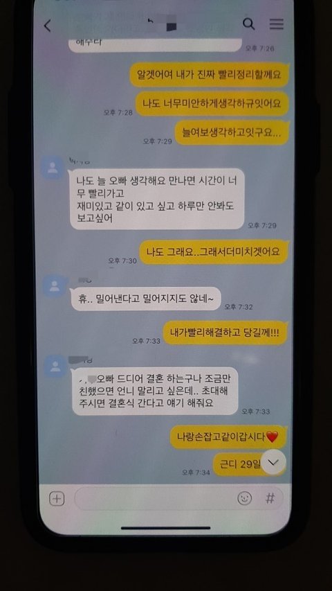 그 카톡을 읽고 한두 달 만난사이가 아닌지라 만나서 얘기하자 했으나, 전 남친은 미안하다는 핑계로 전화는 물론 만남조차 거부함. 전 남친 헤어지자고 했다는 걸 그 친구에게 말했는지 바로 친구 카톡에는 디데이 로 사귄 날짜를 설정함.