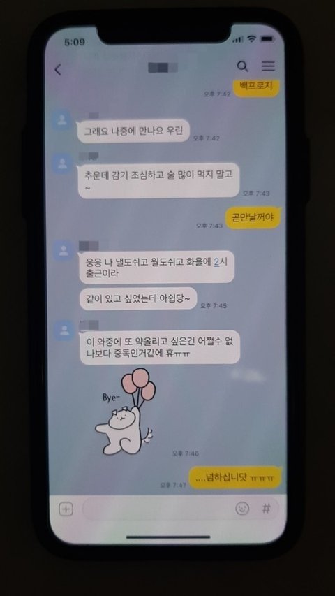 1/15일 일주일간 맘고생으로 인해 컨디션이 안 좋아 회사에서 조퇴 후 집에 와서 잠이 들었음. 자고 일어나니 전 남친 으로부터 헤어지자는 카톡이 와 있었음.