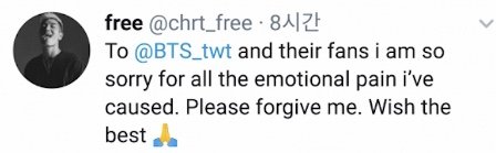 방탄소년단과 팬들에게 내가 일으킨 감정적인 고통에 대해 정말 죄송합니다 용서해 주세요 행복을 빕니다 이렇게 올림