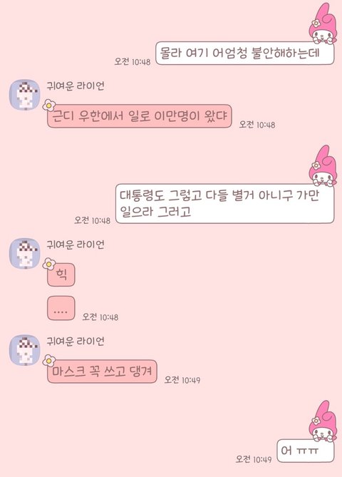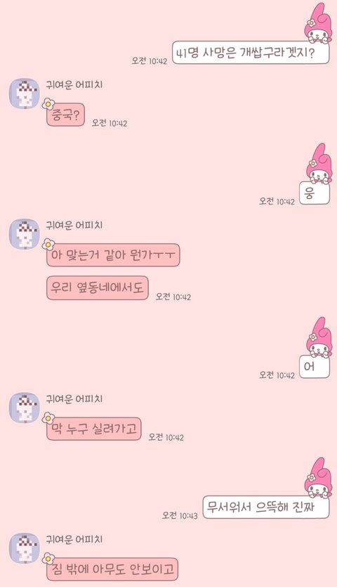 우한에서 꽤 떨어진 천진 사는 내 친구도 우한에서 2만명 왔다 그러고 마트가 난리났대 얘는 집에 라면이랑 햇반 채워놓고 안 나간지 꽤 됐대 비교적 떨어진 천진에서도 이렇게 사람들 실려가고 중국 사는 사람도 상황이 어떻게 돌아가는지 모르겠대... 일단 안심할 상황은 절대 아니래 꼭 한국도 마스크 쓰고 다니고 조심 또 조심하래 계속 불안해 해야된대