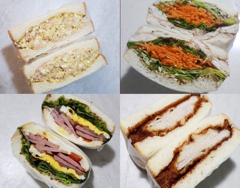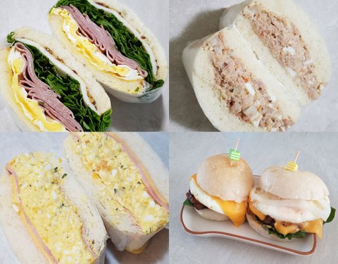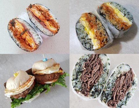 랩으로 싸서 먹고 버릴수있게 샌드위치, 밥버거, 미니버거, 김밥을 싸주었어요