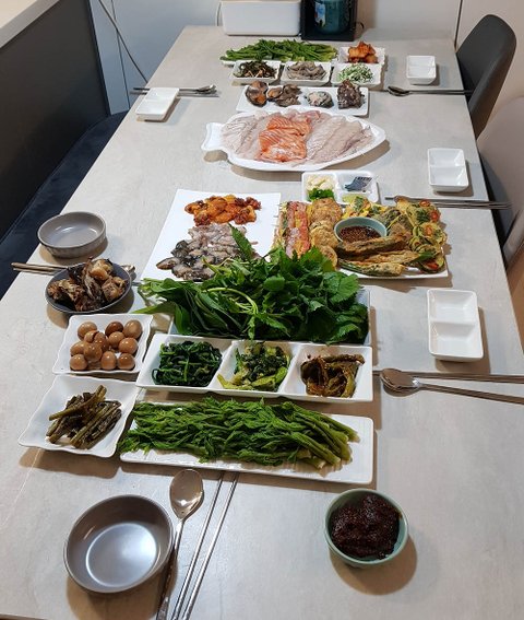 곰취 두릅 산미나리 영양부추 고추 등등 고기에 싸먹으면 완전꿀맛이에요 ㅋㅋㅋ