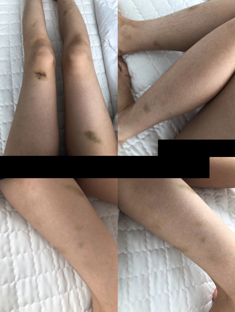 (참고로 왼쪽 무릎 위에 생긴 피멍은 제 부주의로 인한 상해이며, 원래 저 위치엔 손자국으로 인한 작은 멍만 있었습니다)