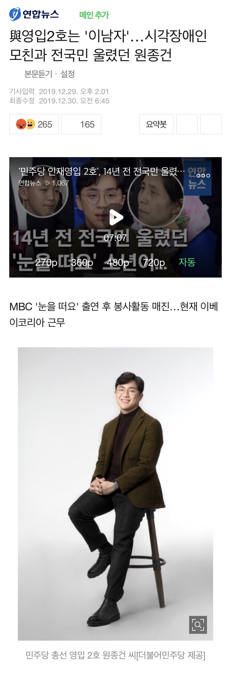 원종건 씨는 시각장애인 어머니와 함께 2005년 MBC 프로그램인 느낌표 <눈을 떠요>에 출연해 어머니가 개안수술을 받은 사연으로 알려져 있습니다.