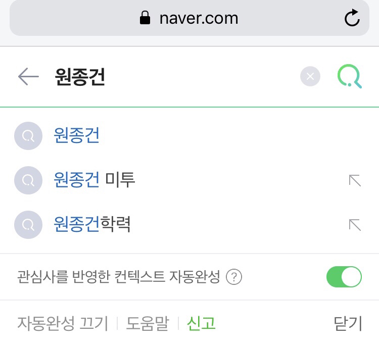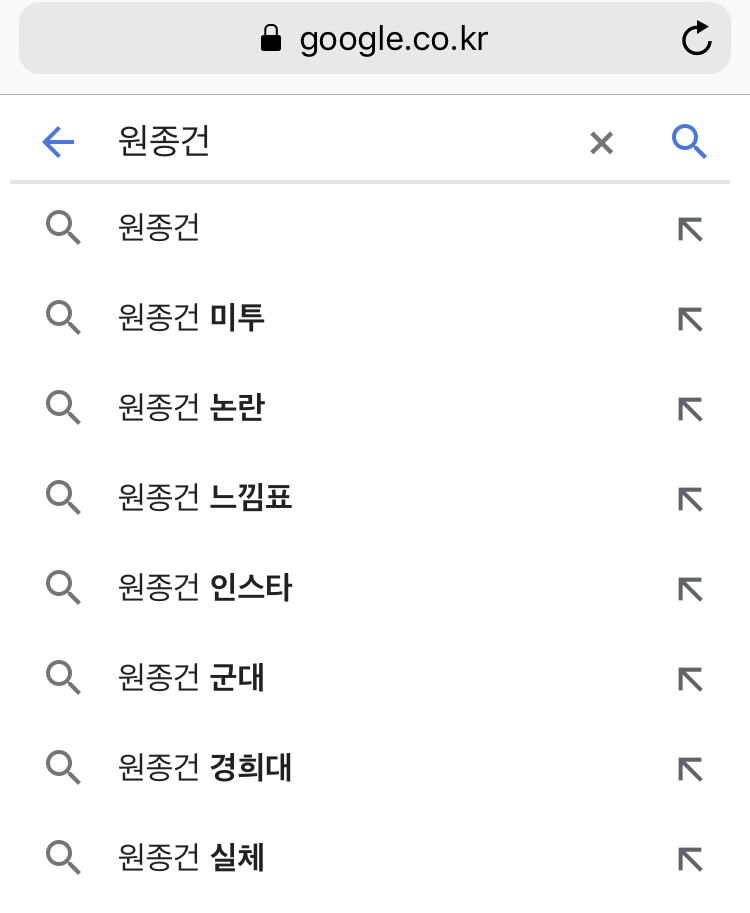 구글에 원종건만 검색해도 미투가 자동으로 따라 붙습니다. 지금은 내려갔지만 네이버에도 해당 단어가 뜨곤 했습니다.