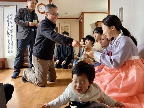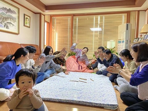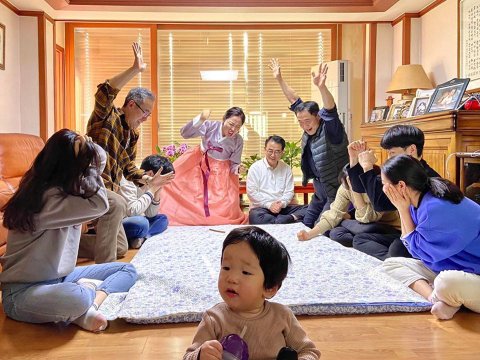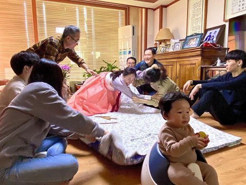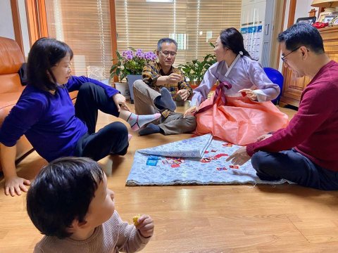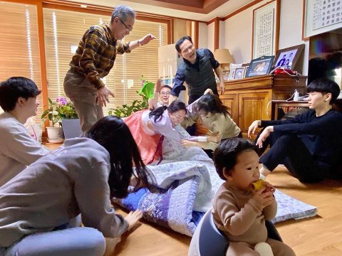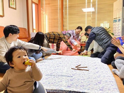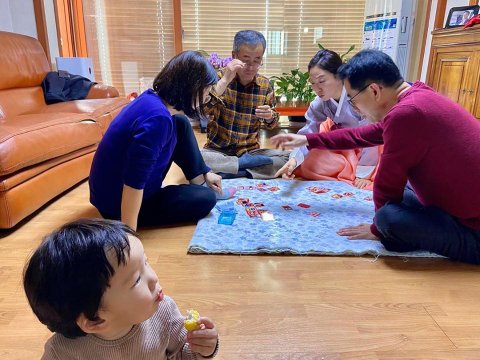 이젠 다 같이 모여서 화목하게 윷놀이를 하는 이미도가족