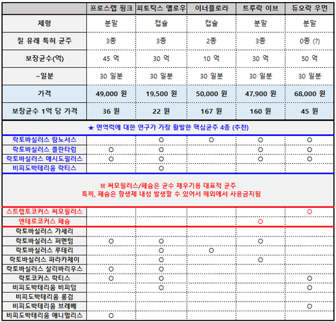 *가격이 저렴해서 많이 팔리는 ㄹㅌㅍ은 보장균수가 낮고 페슘이 들어갔으며 균주 자체가 좋지 않아 비교표에 기재하지 않았음