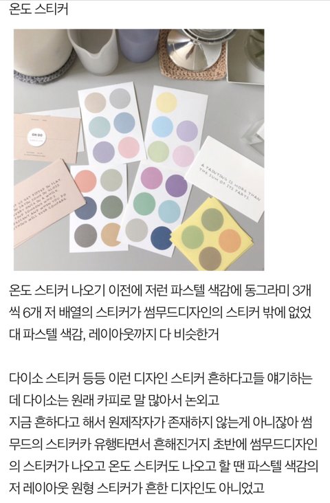 자기가 잘 사용하던 제품을 며칠 뒤에 판매 목적으로 내가 디자인 했어 ! 나만의 브랜드를 만들거야 ~ 온도 학용품 !! 오브X트에서 스티커 몇개 든 팩 비싸게 팔아먹고 유명해지니까 너도 나도 따라서 비슷한 스티커 만들고 ( 다X소 )
