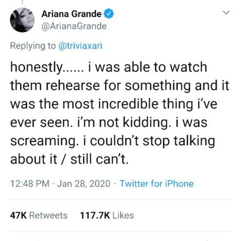 방탄도 어제 아이하트 라디오 생방에서 콜라보 하고 싶은 가수 중 하나로 아리아나를 언급했었음 (왠지 훈훈)