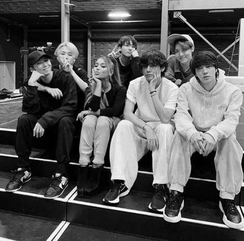 (실제 리허설 현장에서 만난 후 방탄과 아리아나가 함께 찍은 사진)