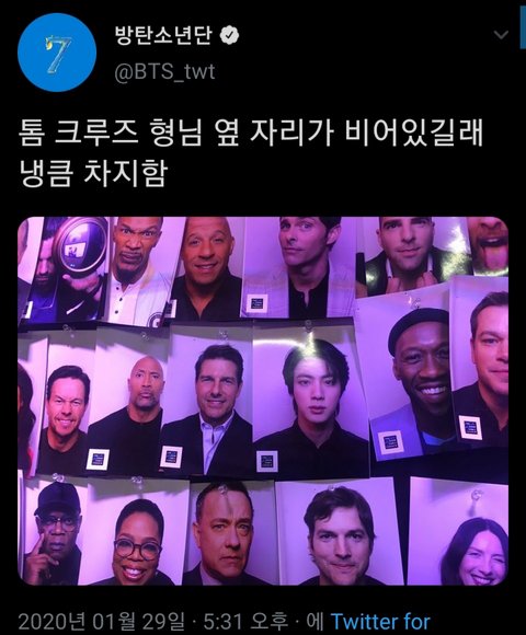 ㅋㅋㅋㅋㅋㅋ진 제임스코든쇼가서 톰크루즈형옆자리 차지하고왔네ㅋㅋㅋㅋ수많은스타들과같이 개간지다..