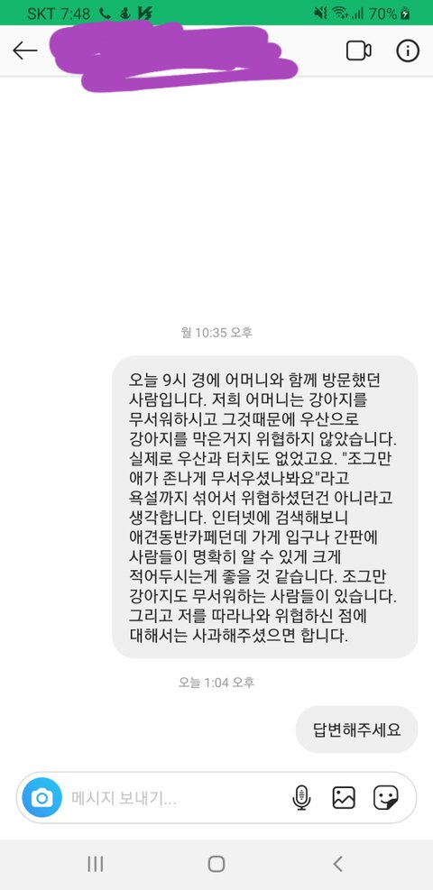 남자는 계속 “저 조그만 애가 존*게 무서우셨나봐요. 우리 애기다. 우산으로 강아지를 위협했다.” 이런 식의 말씀을 반복하셨습니다. 남자분은 다른 친구분들이 말려 들어가셨습니다. 저는 너무 놀라서 말을 못했고, 옆에서 다른 친구분들도 가시라는 말을 되풀이했습니다. 어머니가 “저 강아지도 누구는 무서워 할 수 있다, 강아지 싫어하는 사람도 있다”라고 친구분들에게 말하자 그분들은 “우리도 당신이 싫다”라는 말을 하시며 가셨습니다.