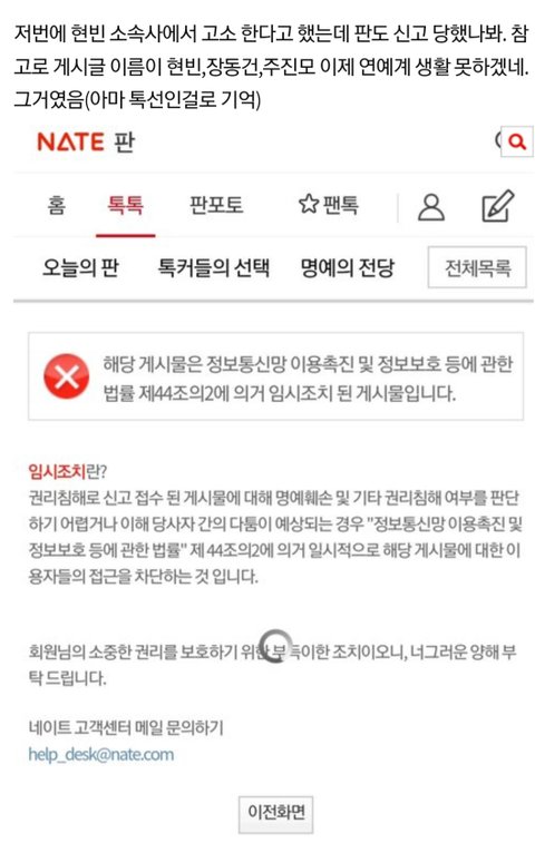 이건 신고 많이 당해서 된게 아니라 당사자나 법률 대리인이 네이트판 본사에 연락해서 내려야 임시조치 되는 거임