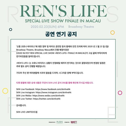 2020 NU'EST REN SPECIAL LIVE SHOW #RENSLIFE_FINALE_IN_MACAU 공연 연기 안내