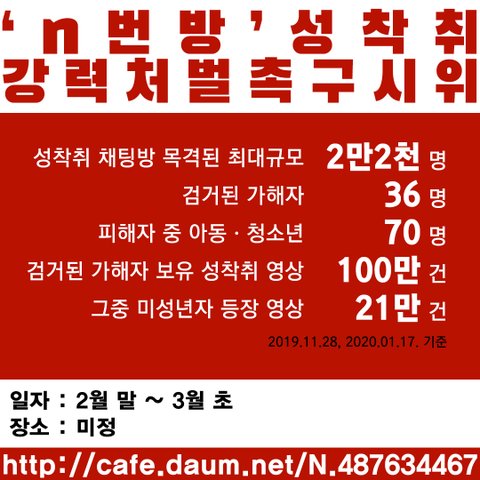 하지만 가해자들의 처벌은 그야말로 솜방망이에 그쳤고, 그 솜방망이 처벌조차 피한 수많은 가해자는 텔레그램으로 이주해 성착취 범죄를 계속해서 저지르고 중계했습니다. 인터넷에는 그 링크를 구걸하는 글이 수도 없었습니다. 한 가해자는 버닝썬 게이트를 보고 나도 한번 해봐야겠다는 마음을 먹었다고 밝혔습니다. 신고해도 제대로 수사도 안 한다면서요. 이것을 지켜본 여자들은 더 이상의 디지털성범죄를 막기 위해서는 강력처벌만이 답이라고 결론내리고 시위를 기획중입니다.
