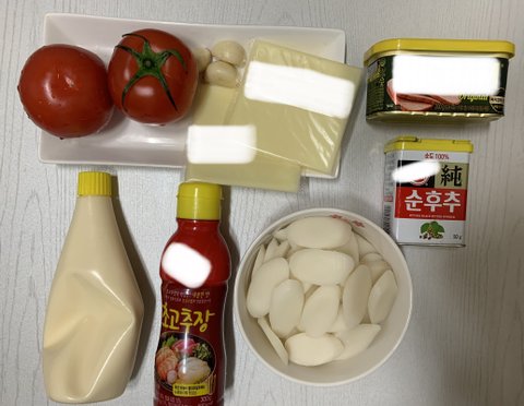 토마토 2개, 마늘 세알, 떡한그릇, 슬라이스치즈2장,