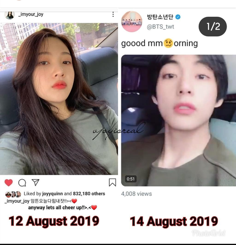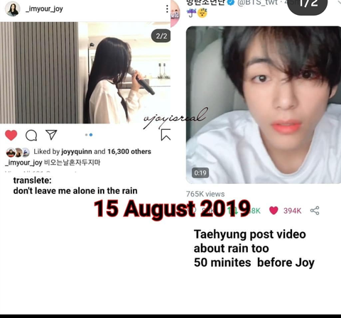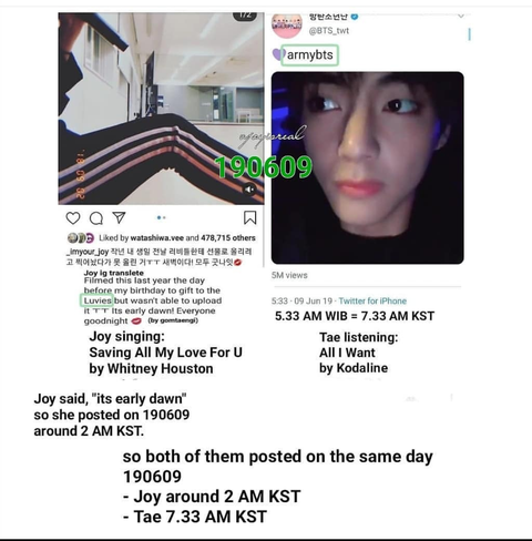 +작년에 조이가 노래불러서 인스타에 올린적 몇번 있는데 그때마다 뷔가 같은날이나 이틀후에 노래듣는 영상 올림