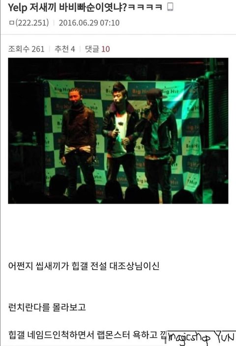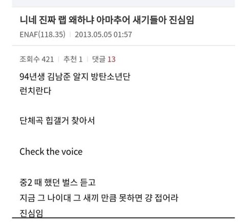 야 근데 방탄 진짜 존1나 랩으로 과소평가 당한다ㅋㅋㅋㅋㅋ 지코랑 송민호랑 바비랑 비아이한테는 탈아이돌, 아티스트,랩잘하는 아이돌이 아니라 아이돌 잘하는 래퍼다 이러면서 방탄은 저런 말하는 힙찔이들한테 랩 잘한다고 칭찬 듣는 경우 많이 못봄ㅋㅋㅋㅋㅋㅋ 예전에 지코랑 알엠이랑 뭔 무대비하인드 영상 있었는데, 알엠이 15세 지코가 17살 때 같이 공연했던 얘기 하고 있었거든? 근데 지코가 자기 입으로 자기는 하수였고 알엠은 인정받는 유망주였다고 그랬는데 저 힙갤 글에도 그렇게 써있네ㅋㅋㅋ 더 웃긴 건 바비는 알엠한테 자기는 아이돌 래퍼 인정받으려고 쇼미 나가고 이러는데 뭐 다른 아이돌 래퍼들은 안그래서 화난다? 대충 이러면서 알엠이랑 다른 아이돌 디스 했었잖아. 근데 저기 힙갤에도 써있지만 바비는 언더에서 힙갤대조상님,천재라고 불리던 알엠을 디스한 거 아니냐ㅋㅋㅋㅋㅋ개웃겨ㅋㅋㅋㅋㅋㅋㅋ
