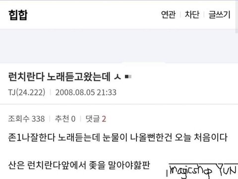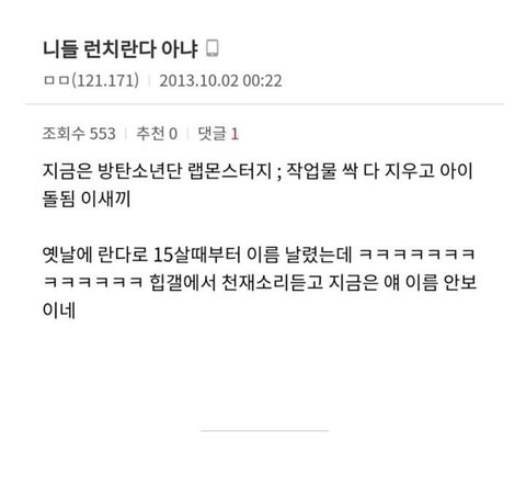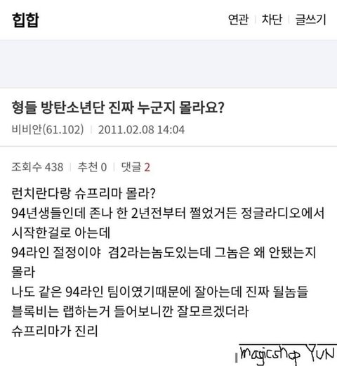 어린데도 존재감 있었고 언더에서 창모랑 지코랑 힙합씬 루키였음 같이 공연도 하고. 비슷한 나이 또래 애들 모여서 대남협이라는 힙합 크루 만들고 원년멤버였다가 빅히트 연습생 들어가서 방탄소년단 리더가 된거임. 그때 대남협에 있던 슈프림보이도 같이 빅히트로 가서 연습생하다가 슈프림보이는 프로듀싱 쪽으로 빠짐. 당시에 런치란다로 유명해지니 하던 힙합 버리고 아이돌한다고 아니꼽게 보는 사람들도 많았음. 근데 지금 RM은 여전히 힙합에 진심이고 많이 힘들었을텐데 증명해낸게 대단함.