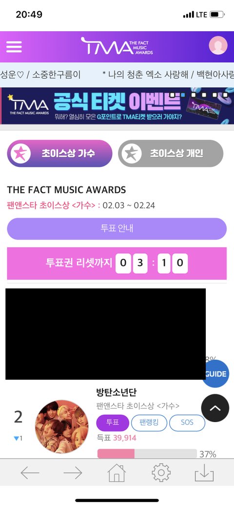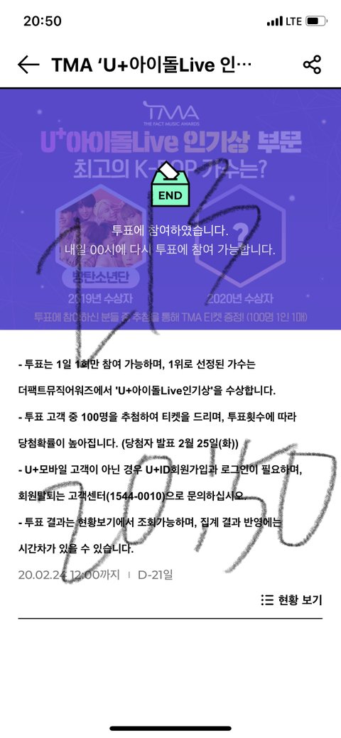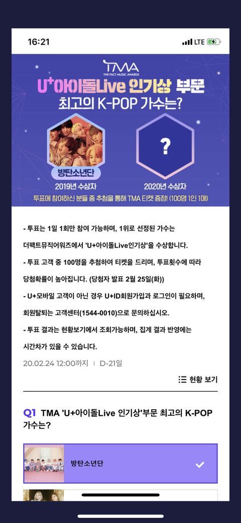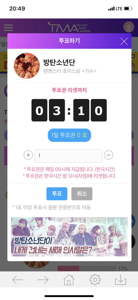 방탄소년단 클릭후 스크롤 내려서 투표 클릭