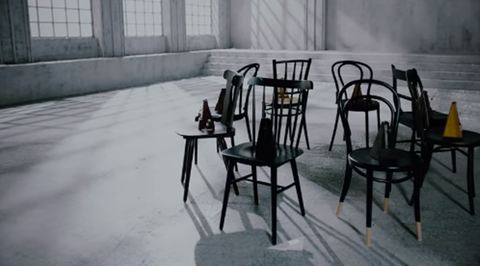 검은색 의자가 있는 곳에 떨어진 하얀 종이 비행기