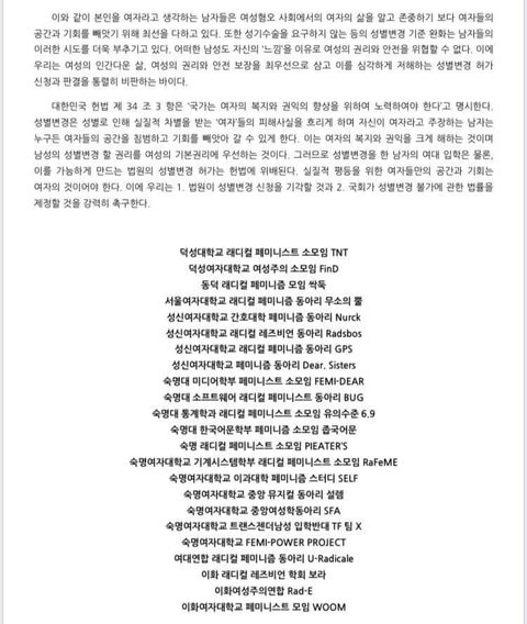 각 대학교 여성주의 동아리들이 성별정정 금지 조항을 만들자며 서명운동을 벌이고 있는 실태.