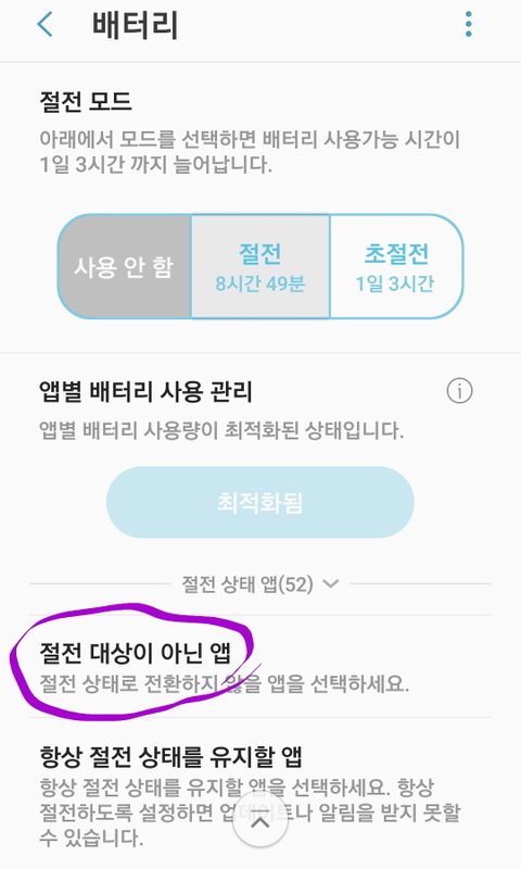 배터리 절전 기능에서 절전앱에 있으면 해제하고 절전하지 않을 앱으로 설정