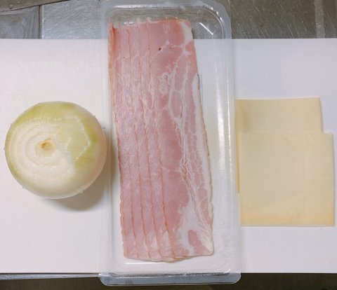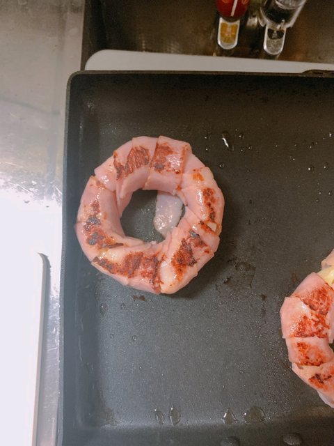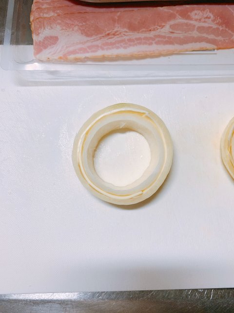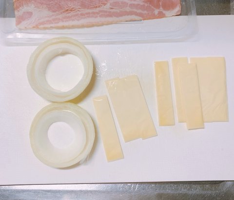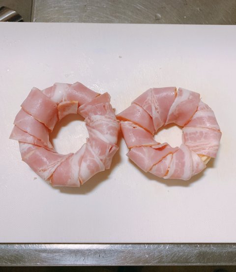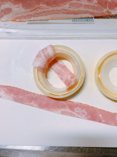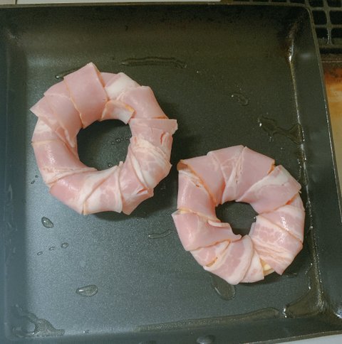 치즈가 포개진 양파링에 반등분해서 얇게 잘린 베이컨을 감아준다(주의할 건 잘 풀리기 때문에 붕대 감듯 잘 잡아가며 이어감아준다.)