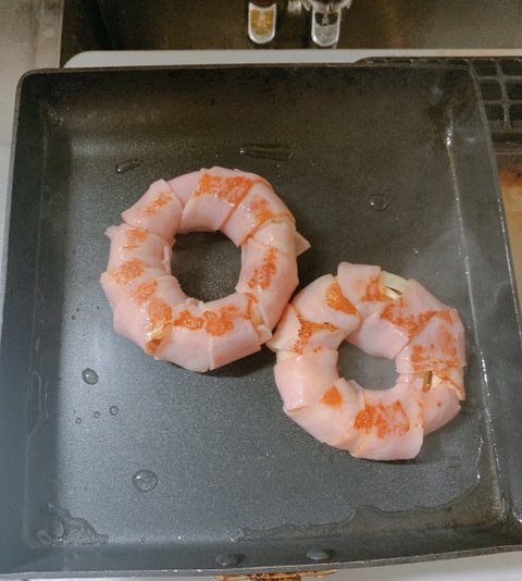 베이컨이 감긴 양파링에 기름을 살짝 두른 판에