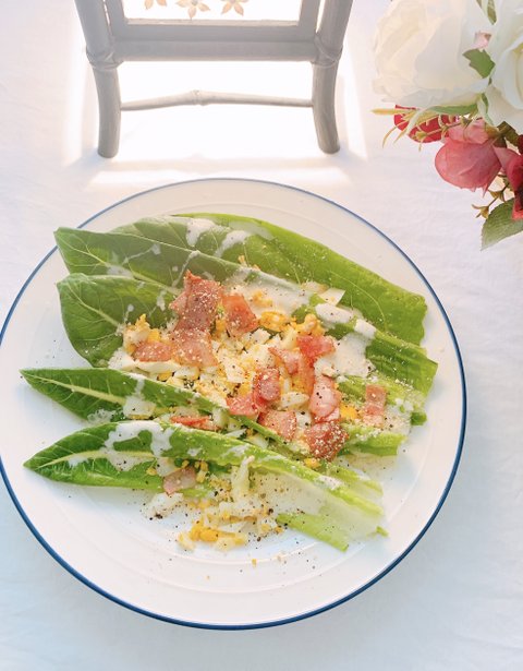 로메인 상추에 계란 하나를 삶아 으깨고 남은 베이컨을 조각내 구워 시저드레싱에 파르메산 치즈, 후추등으로