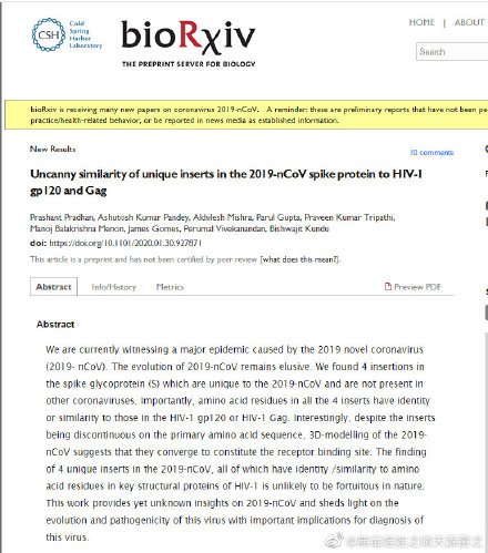 2019년 우한에서 나온 신종 coronavirus의 염기서열(DNA sequences)에서 일명 에이즈라고 하는 면역결핍증(HIV1)의 아미노산 4개 발견 … 박쥐에서 나온 original coronavirus에는 면역결핍증(HIV1) 아미노산 없다 … 누군가, 유전자 합성해서 생화학무기 생산