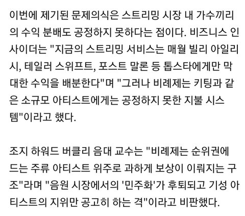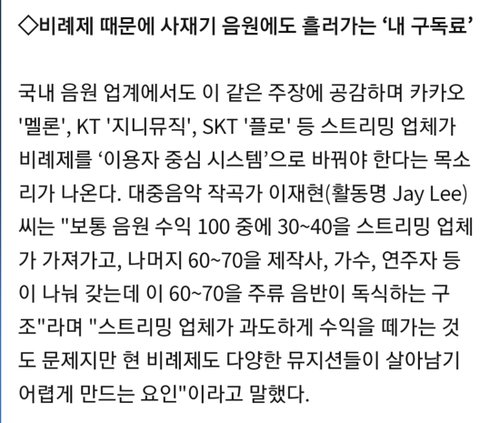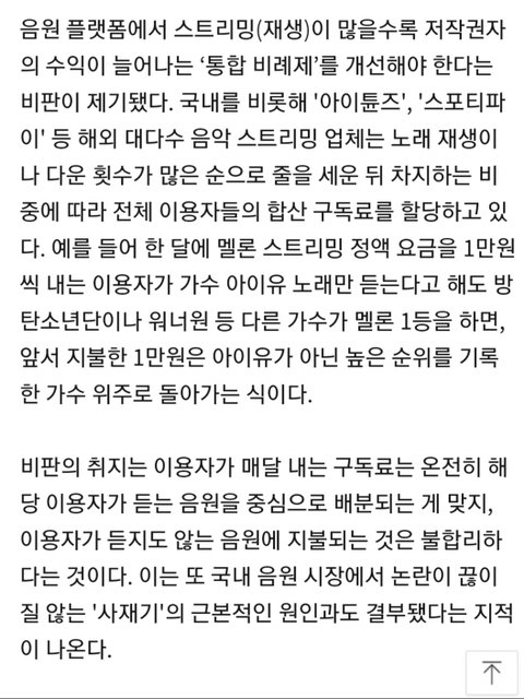 이게 음악시장이아니라 마트에서 사는 제품이라고 치면 조카 심각한거같음. 식품업체 a,b,f,g 그리고 S 가 있는데 S회사제품이 압도적으로 판매량이 높다면? S회사는 잘팔리는거 믿고 상품개발 안하고 abfg는 좋은제품 만들고 실제판매량도 괜찮은데 S에 눌려서 제대로된 돈 못받고 더이상의 개발도 못한다는거잖아.그면 소비자는 좋은 제품 살 기회를 잃는거고.
