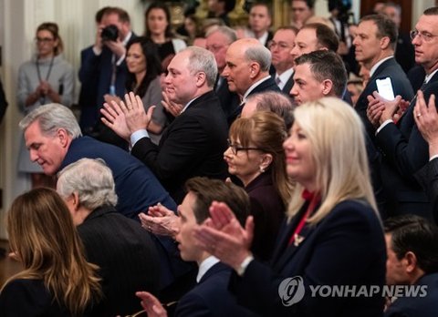 (사진3 설명) 트럼프 대통령 발언에 박수치는 백악관 연설 참석자들 <UPI=연합뉴스>