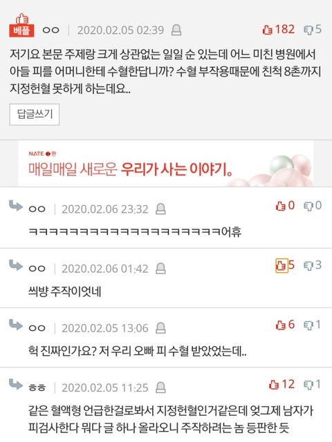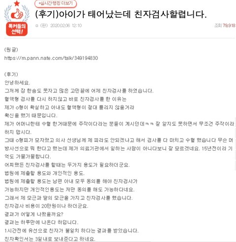 1편 : 아내가 출산을 했는데 아이의 혈액형 ABO법칙상 절대 나올수 없는 혈액형이다. 친자검사 할것이다. (+) 혈액형을 잘못 알고 있을리 없는 이유는 어머니에게 지정헌혈을 한적이 있기 때문 (네이트판에 와서 의견을 묻는 것이 아니라 통보 고지함)