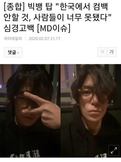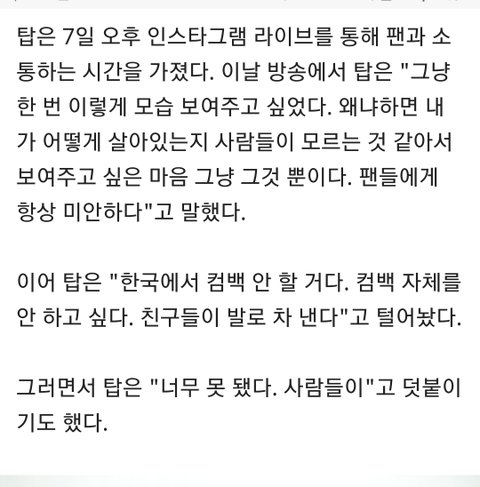 욕하던 이 댓에 반대 박던 뭐라 안하는데 나 탑 라이브봤거든 근데 저거 기자들이 다 짜집기한거야. 탑이 라이브 킨 이유는 자기가 어떻게 사는지 모르는거 같아서 팬들한테 그냥 이렇게라도 알려주고 싶어서라고 했고 저때 술 먹기 전 맨정신이였어. 그 상태에서 자기는 괜찮지않다고 항상 혼자라고 안괜찮대 그냥 항상 팬들한테 미안하다고 그렇지만 한국 컴백하고 싶진않다고 아무 생각 없는 사람인데 기자들이 기사 써 나르는거라고 사람들이 나쁘다고. 제발 하지말라고 했어. 얘가 마약한건 잘못한건 맞는데 그만 좀 내버려두자 이번건 진짜 기자들이 잘못한거야. 이러다 진짜 사람하나 죽겠어 제발 탑 좀 가만히 내버려두자