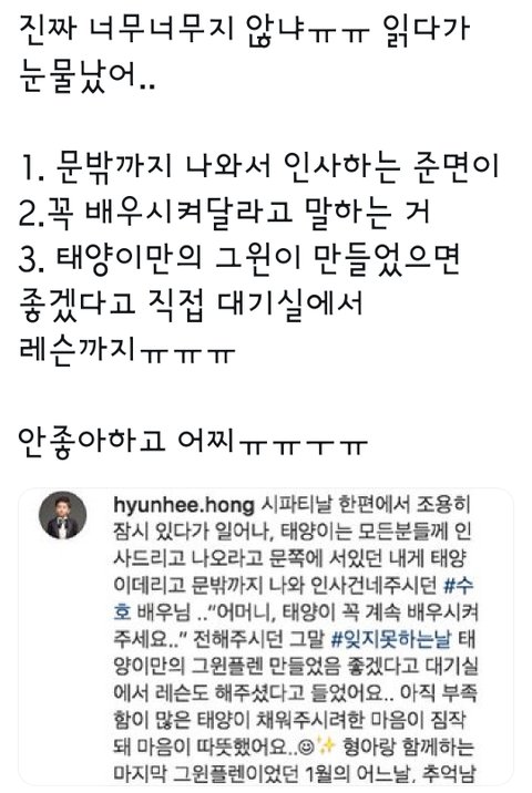 아역 그윈 어머니가 인별에 써줬는데 읽어보셈 훈훈하다 훈훈해ㅎ 준면이 직접 레슨도 해주고 아역 배우랑 추억 남겨준다고 먼저 사진도 찍어주고ㅠㅠ