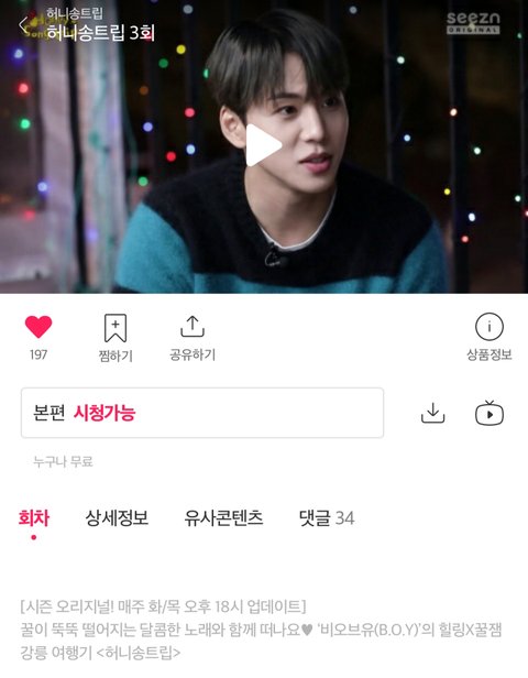 아무튼 3회도 짧지만 뵤뷰 티키타카부터 맛있게 먹는모습까지 다 담겨있어서 시간 순삭이었당..bb 비오브유쇼도 끝날때 아쉬워 미쳤는데 허니송트립은 더할것같은 예감이 드는 회차였어 ㅍ