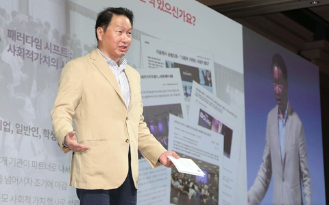 (사진 설명) ▲ 최태원 SK그룹 회장이 지난해 7월 18일 제주 신라호텔에서 열린 제44회 대한상의 제주포럼에서 '기업의 Breakthrough 전략, 사회적 가치 창출'이라는 주제로 강연 하고 있다. <SK텔레콤 제공>