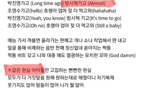 쟤네 소속사대표 방시혁 디스한거모르냐 방시혁은 까놓고 방탄은 롤모델? 쟤네 소속사 대표께서 아이돌 ㅈ같다하는데 방탄이 롤모델? 쟤네 소속사 대표가 방시혁 좀 가라는데 방탄이 롤모델? 아미들 훅가요란 노래 좀 들어봐 제발 꼽주는건 이유가 있으니까 주는거야 아무 이유없이 주는거면 아미가 아니겠지