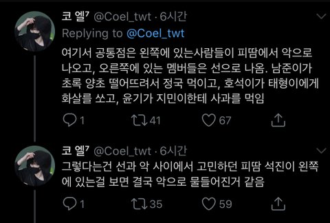 근데 데미안에서 악이 그냥 악마라기 보단 알을 깨고 나오기 전에 아직 낯설고 무서워 보이는 외부 존재를 말하는거 아니었어? 이번 쉐도우도 그냥 무섭고 피해야하는 존재가 아니라 결국엔 같이 손잡고 같이 극복해야하는 존재니까. 석진이가 막 일을 해결하려고 하는게 다른 애들에겐 무섭고 이상하게 느껴지고 그런건가...?