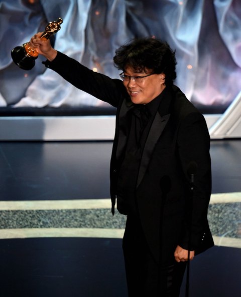 수상 무대에 오른 봉준호 감독은 트로피를 들어올리며