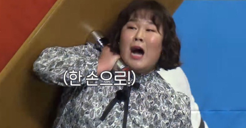 그러나, 사회자가 한 손으로 아령을 들어야 한다고 하니까