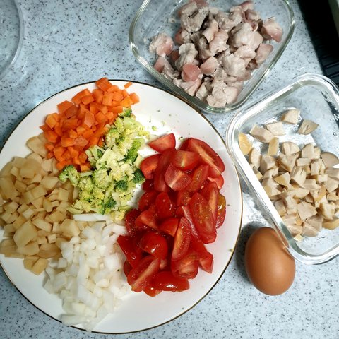 그래서 닭가슴살180g, 두부한모(작게 썰어서 노릇노릇 구워서 넣어야해요. 부서지지않게)