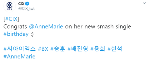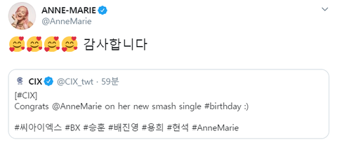 씨앗이들이 앤마리 신곡 발매한거 축하한다는 트윗 남김