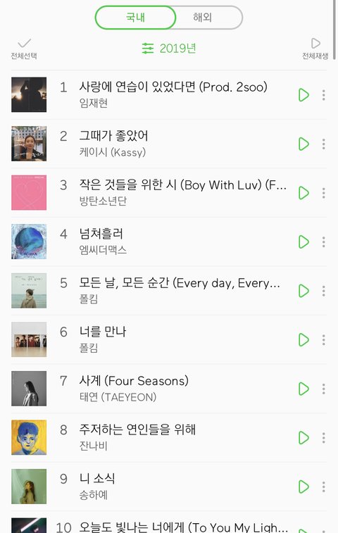 진짜 구라안치고 저노래 한 번도 안들어봤는데 이건 아니지 ㅋㅋㅋㅋㅋㅋㅋㅋㅋ 사재기때문에 연간에 못든 가수들 너무 불쌍함 2019년은 기계의 해인것 같음 솔직히 사랑에 연습이 있다면이 작년 사랑을 했다나 2017 첫너가 2016 치얼업 처럼 대한민국을 강타한 노래가 아니잖아 ㅋㅋㅋㅋㅋㅋㅋㅋㅋ