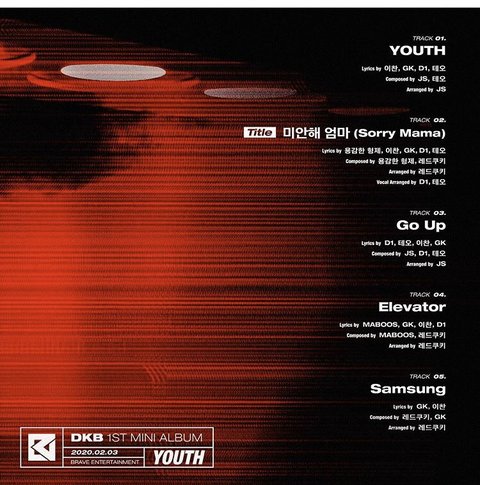 이외에도 데뷔앨범에는 인트로 'YOUTH'와 'Go Up(고 업)', 'Elevator'(엘리베이터)', 'Samsung(삼성)' 등이 앨범에 수록되어 있다.