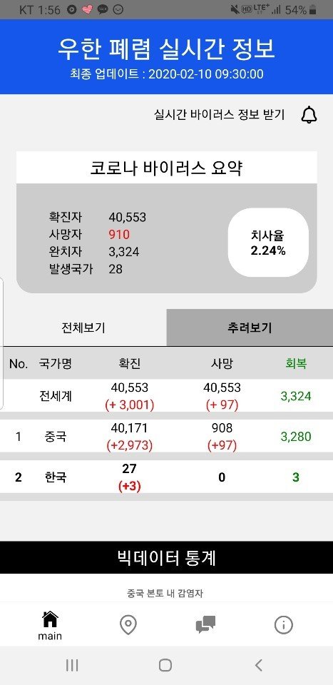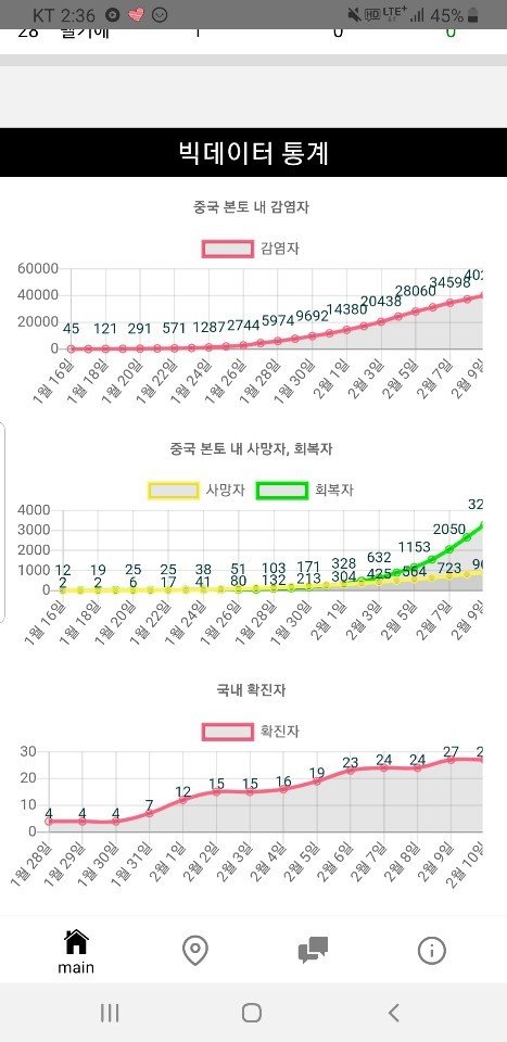 또한 빅데이터 통계를 통해 감염자 수, 확진자 수, 회복자 수를 그래프를 통해 직관적으로 보여주기 때문에 코로나 바이러스의 위험성을 잘 알 수 있습니다.