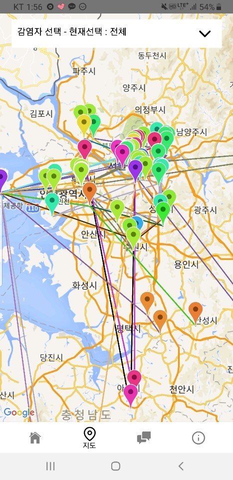 현재 확진자들의 위치와 동선, 위험지역을 지도를 통하여 직관적으로 표현하였으며, 확진자 별로 각각의 이동경로를 알 수 있습니다.