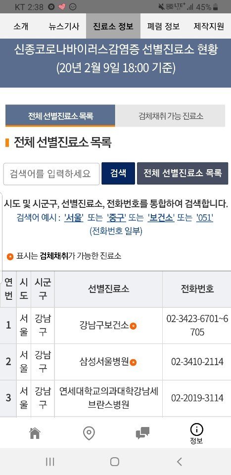 또한, 신종코로나바이러스감염증 선별진료소 목록과 현황과 위치, 전화번호까지 알려주고 있으며, 검사채취 가능 진료소에 대한 정보도 제공하고 있습니다.