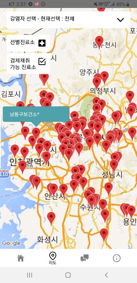 또한 선별 진료소 위치 또한 지도에 쉽게 안내하고 있어 정보 제공에 관한 정확성을 엿볼수 있습니다.